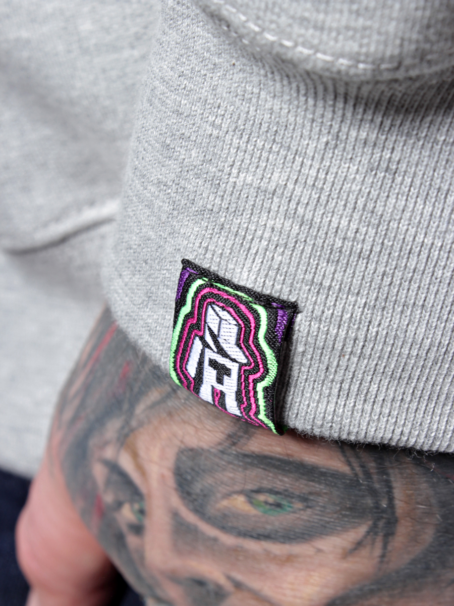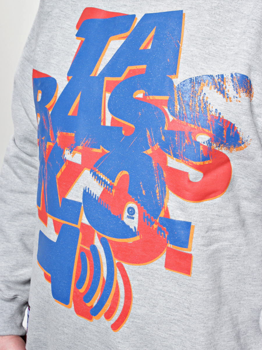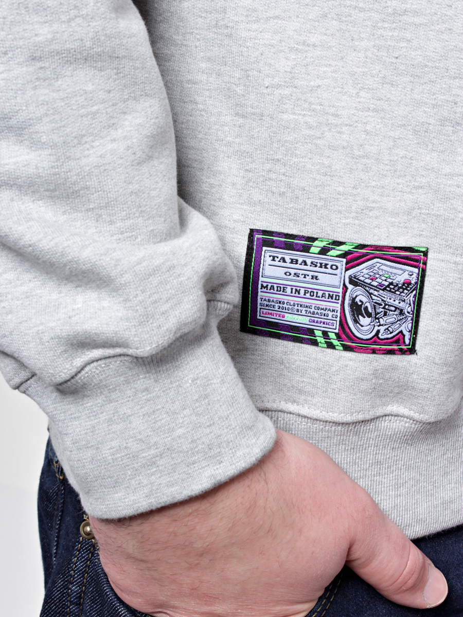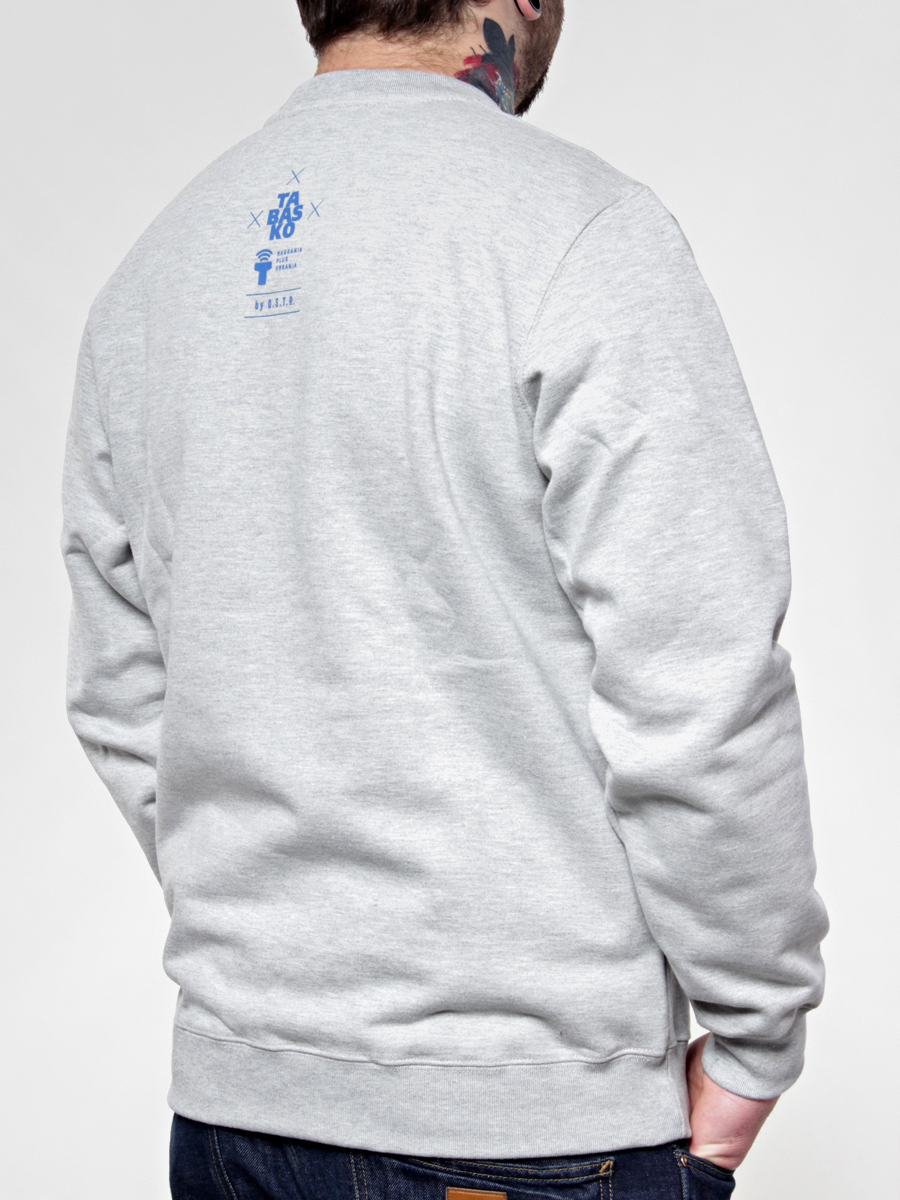 • Klasyczna szara bluza z dużym nadrukiem z przodu i małym na karku