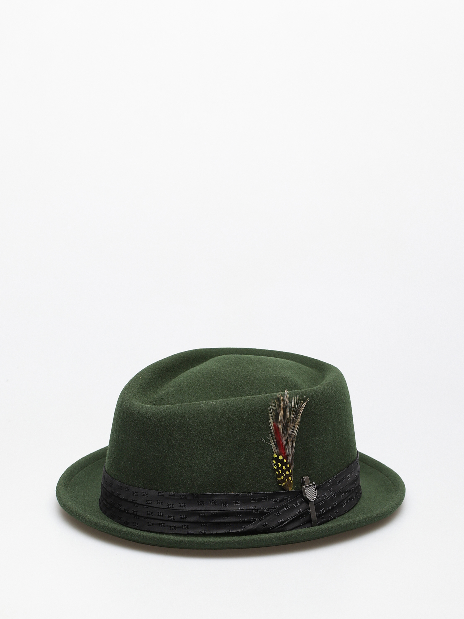 • Brixton Stout Pork Pie to elegancki, filcowy kapelusz o krótkim rondzie przyozdobiony satynową opaską, piórami i metalową spinką z grawerowanym logo Brixton ...